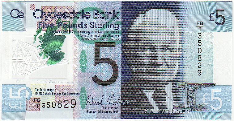 Clydesdale Bank Plc From 1982 5 Pounds, 13. 2.2015SC333a5 Pounds13. 2.2015