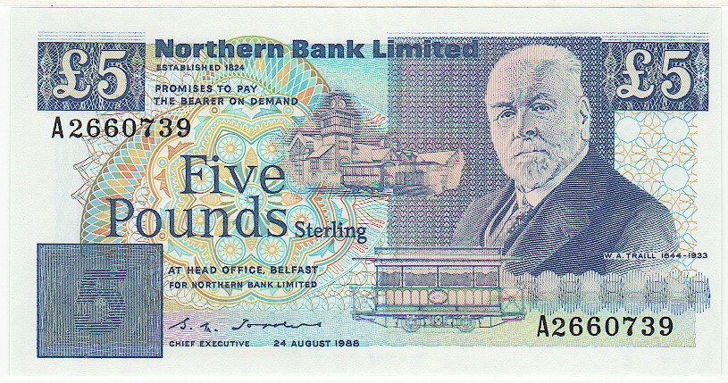 Image BYB ref. One Pound notes NI.601b 1 Pound 6. 5.1929Prefix N-I/B VF+ £95.00 NI.601b 1 Pound 1. 8.1929Prefix N-I/F aUNC £250.00 NI.602a 1 Pound 1. 7.1970Prefix C UNC £35.00 NI.602as 1 Pound 1. 7.1970Prefix C0000000 UNC £11.00 Specimen - Training note NI.602a 1 Pound 1.10.1971Prefix C UNC £35.00 NI.602c 1 Pound 1. 8.1978Prefix C UNC £25.00 Five Pound notes NI.613c 5 Pounds 1.11.1943Prefix N-I/T aUNC £220.00 NI.613c 5 Pounds 1.11.1943Prefix N-I/T EF/aUNC £190.00 NI.613c 5 Pounds 1.11.1943Prefix N-I/T EF £160.00 NI.616s 5 Pounds 24.8.1988Prefix A0000000 UNC £140.00 Specimen note NI.616 5 Pounds 24.8.1988Prefix A UNC £44.00 NI.617b 5 Pounds 1. 1.2000Prefix Y2K UNC £42.00 NI.617 are polymer notes, the last £5 notes issued by the northern Bank. Ten Pound notes NI.623g 10 Pounds 1.10.1968Prefix N-I/00 UNC £330.00 NI.624a 10 Pounds 1. 7.1970Prefix E F+/VF £55.00 NI.624a 10 Pounds 1. 7.1970Prefix E VF £50.00 Small ink annotation on the front NI.624b 10 Pounds 1.10.1971Prefix E aEF £90.00 NI.624b is a scarce variety with only 100,000 notes printed NI.624c 10 Pounds 1. 1.1975Prefix E UNC £125.00 NI.624c 10 Pounds 1. 1.1976Prefix E UNC £125.00 NI.624d 10 Pounds 1. 4.1982Prefix E aUNC £105.00 NI.624d 10 Pounds 1. 4.1982Prefix E EF £80.00 NI.624e 10 Pounds 2. 3.1987Prefix E aUNC £85.00 NI.624e 10 Pounds 2. 3.1987Prefix E EF £50.00 NI.625as 10 Pounds 24.8.1988Prefix B0000000 UNC £160.00 Specimen note NI.626a 10 Pounds 24.2.1997Prefix BA UNC £55.00 NI.629 10 Pounds 9.11.2008Prefix GG UNC £40.00 NI.629 10 Pounds 30.11.2011Prefix GH UNC £40.00 Last prefix NI.629 10 Pounds 9.11.2008Prefix YY UNC £60.00 Replacement note NI.629 10 Pounds 9.11.2008Prefix YY VF+ £28.00 Replacement note Twenty Pound notes NI.632a 20 Pounds 1. 7.1970Prefix F UNC £490.00 NI.633a 20 Pounds 24. 8.1993Prefix C aU/UNC £175.00 NI.633as 20 Pounds 24.8.1989Prefix C0000000 UNC £200.00 Specimen note NI.634a 20 Pounds 24. 2.1997Prefix CA UNC £100.00 First prefix NI.634a 20 Pounds 24. 2.1997Prefix CB VF+ £28.00 Small 2mm tear in the top margin NI.636 20 Pounds 6.11.2006Prefix HG UNC £38.00 NI.636 20 Pounds 6.11.2006Prefix HH UNC £38.00 NI.636 20 Pounds 6.11.2006Prefix YY EF/aUNC £70.00 Replacement note NI.636 20 Pounds 6.11.2006Prefix YY VF+ £50.00 Replacement note NI.637 20 Pounds 15. 4.2009Prefix HH UNC £38.00 NI.637 20 Pounds 15. 4.2009Prefix YY EF/aUNC £70.00 Replacement note NI.637 20 Pounds 12. 5.2011Prefix HJ UNC £50.00 Last prefix before Danske Bank Fifty Pound notes NI.643c 50 Pounds 1. 3.1981Prefix G VF+ £240.00 One Hundred Pound notes NI.651 100 Pounds 2. 6.1919Prefix No. 5840 EF/aUNC £1,800.00 NI.653a 100 Pounds 1. 7.1970Prefix H VF+ £390.00 NI.656 100 Pounds 19. 1.2005Prefix YY EF £280.00 Replacement note Northern Bank Ltd SPECIMEN SET: NI.Specimen set 5,10, 20, 50, &100 1988, 1989, 1990Prefix A, B, C, D, E. UNC £960.00 NI.616s, NI.625as, NI.633as, NI.644s & NI.654S.