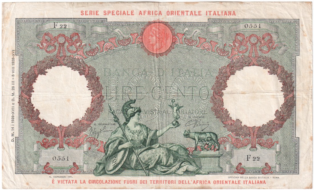 Italian East Africa 100 Lire, 14. 1.19392b100 Lire14. 1.1939F+£230.00