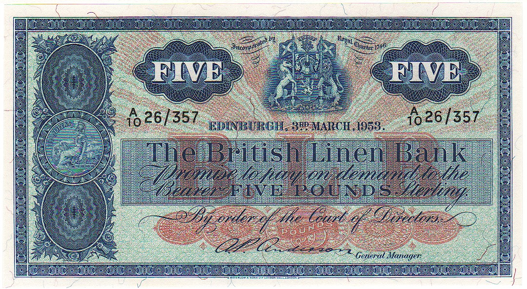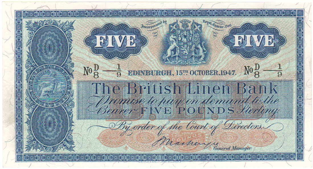 British Linen Bank 5 Pounds, 15.10.1947SC214b5 Pounds15.10.1947