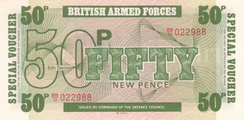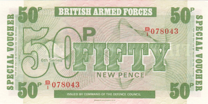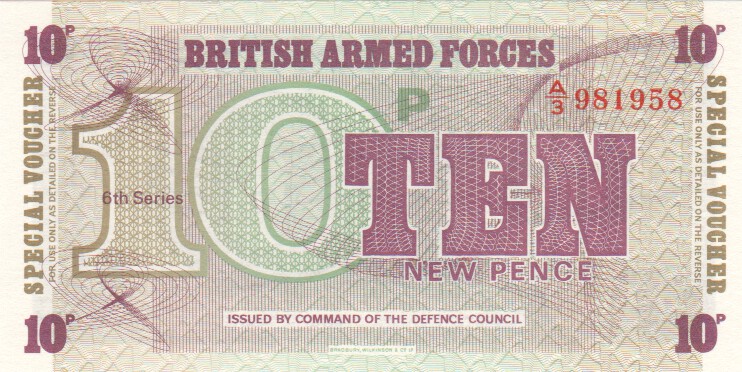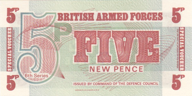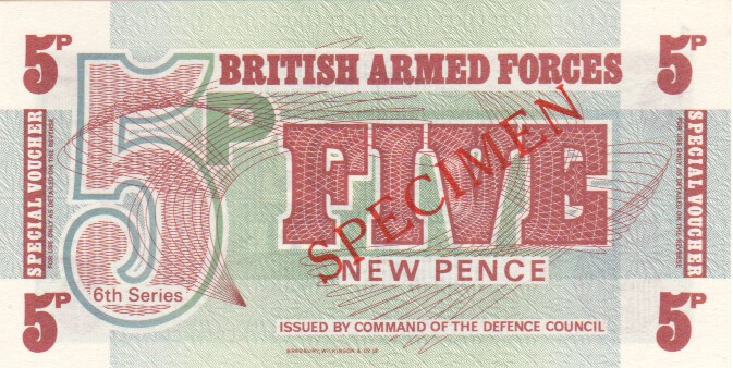 British Military 5 New Pence, M47s5 New PencePrefix (1972)UNC£190.00Scarce, SPECIMEN note