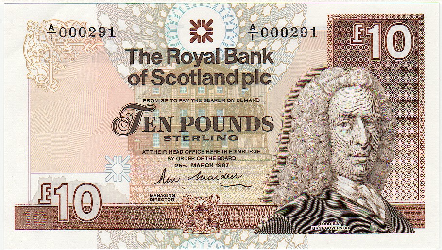 Royal Bank Of Scotland Plc Higher Values 10 Pounds, 25. 3.1987SC85210 Pounds25. 3.1987
