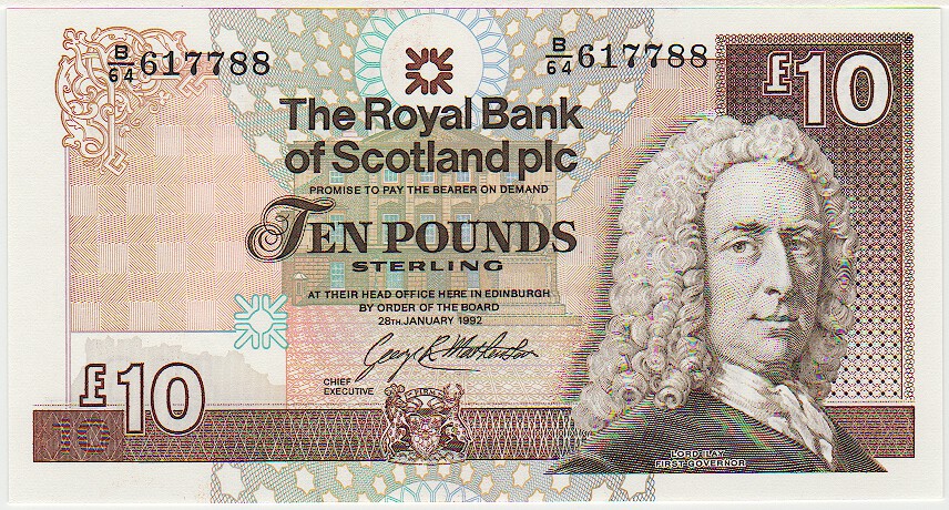 Royal Bank Of Scotland Plc Higher Values 10 Pounds, 24. 1.1990SC85210 Pounds24. 1.1990