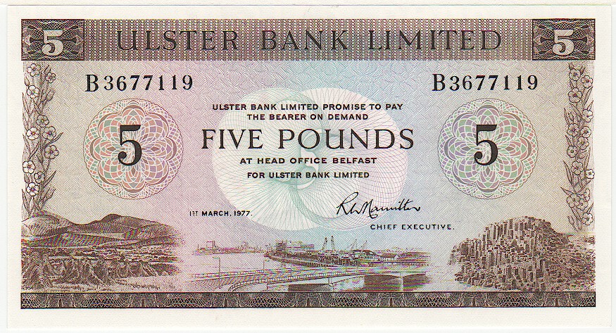 Ulster Bank Ltd 5 Pounds,  1. 3. 1977NI.815bs5 Pounds 1. 3. 1977