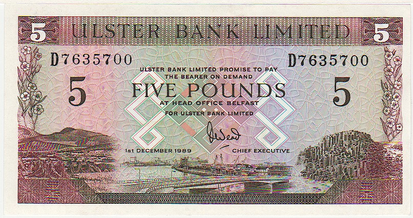 Ulster Bank Ltd 5 Pounds,  1.12.1989NI.8165 Pounds 1.12.1989