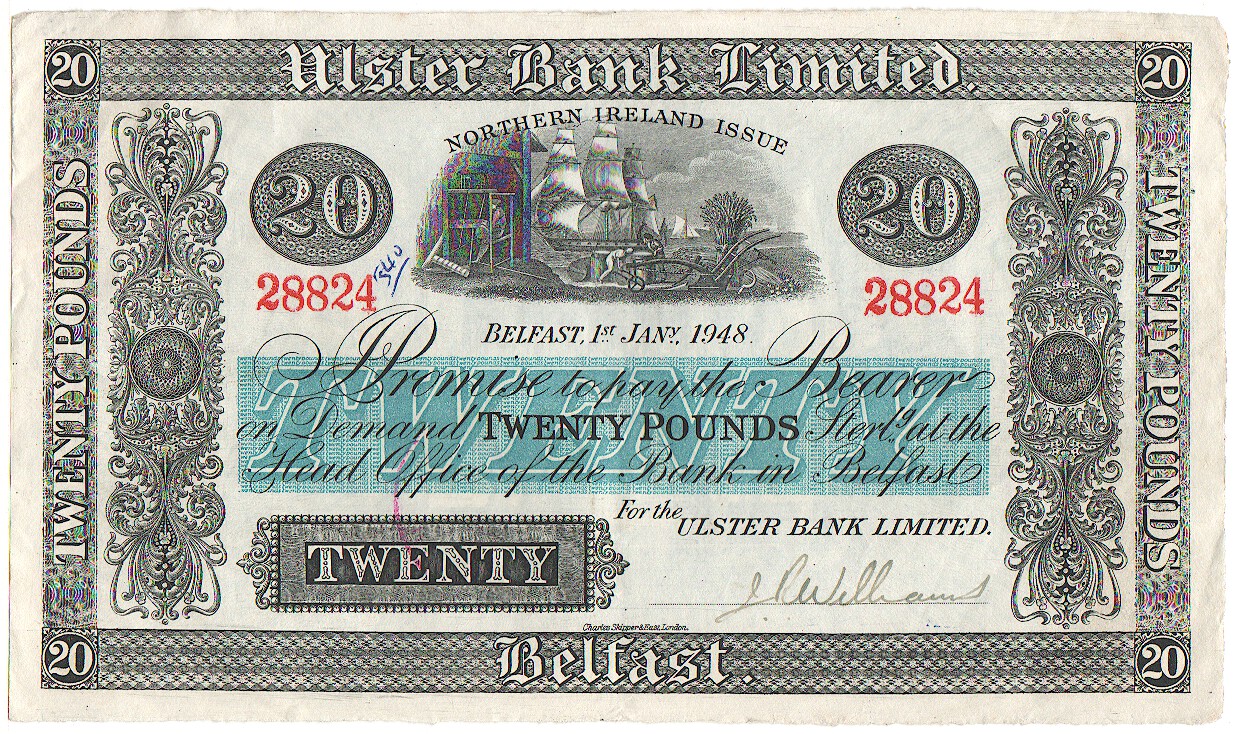 Ulster Bank Ltd 20 Pounds,  1. 4.1943NI.83220 Pounds 1. 4.1943