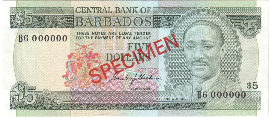 Barbados 5 Dollars, (1976)32s5 Dollars(1976)EF/aUNC£80.00Specimen note