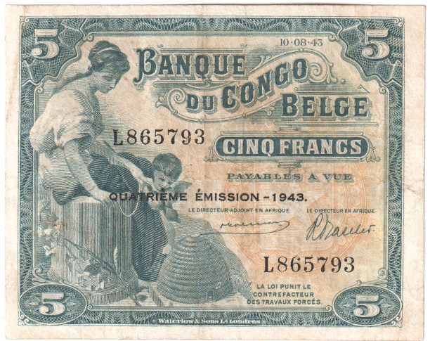 Belgian Congo 5 Francs, 10. 8.194313Ab5 Francs10. 8.1943VF£100.00