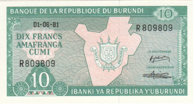 Burundi 10 Francs,  1. 6.198133a10 Francs 1. 6.1981UNC£0.50