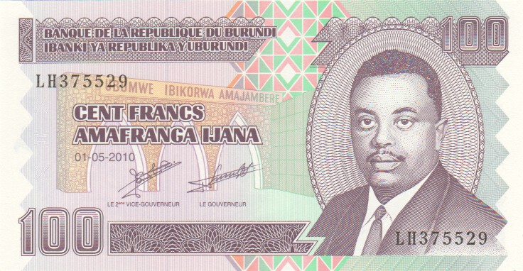 Burundi 100 Francs,  1. 5.201044a100 Francs 1. 5.2010UNC£0.50