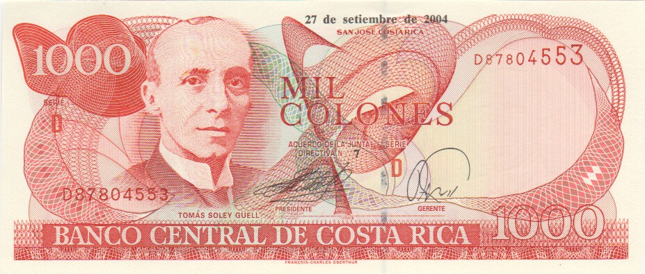 Costa Rica 1000 Colones, 27. 9.2004264e1000 Colones27. 9.2004UNC£8.50