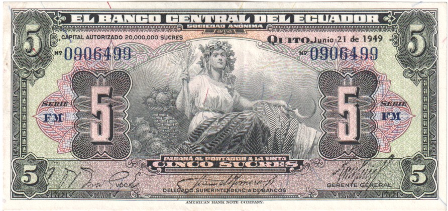 Ecuador 5 Sucres, 21.6.194991c5 Sucres21.6.1949EF/aUNC£115.00