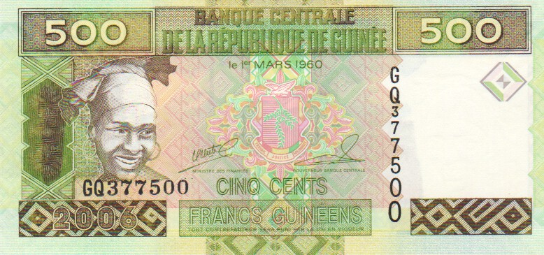 Guinea 500 Francs, 200639500 Francs2006UNC£1.20