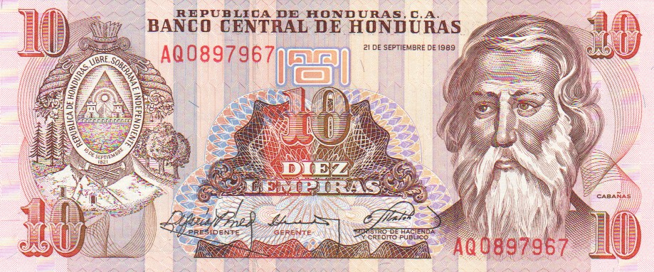 Honduras 10 Lempiras, 21. 9.19897010 Lempiras21. 9.1989UNC£7.00
