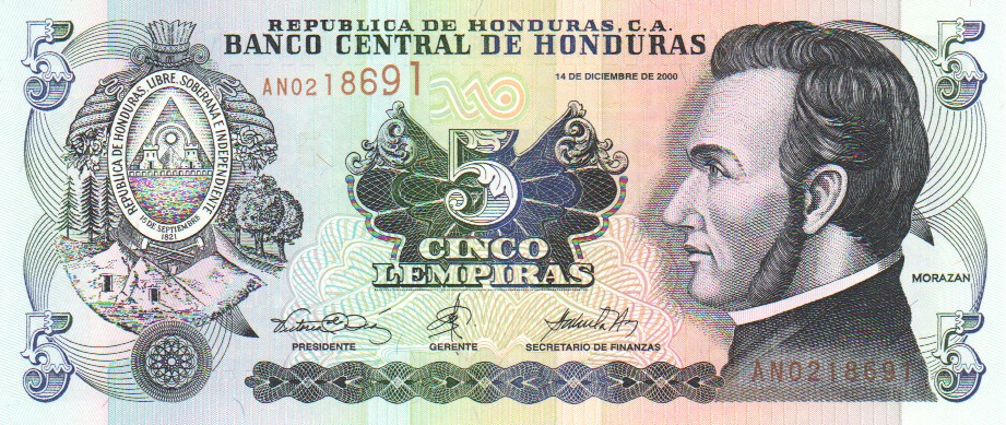 Honduras 5 Lempiras, 14.12.200085a5 Lempiras14.12.2000UNC£2.50