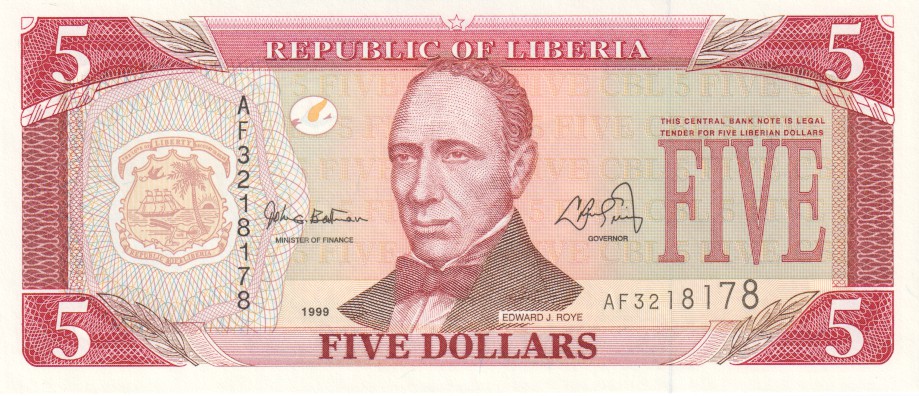 Liberia 5 Dollars,  6. 4.1991205 Dollars 6. 4.1991UNC£6.00