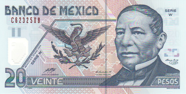 Mexico 20 Pesos, 23. 5.2003116d20 Pesos23. 5.2003UNC£6.50Polymer note