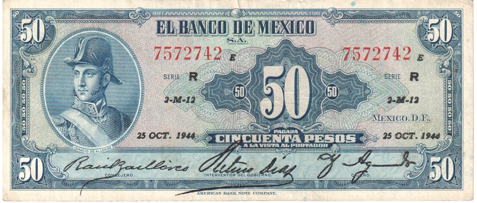Mexico 50 Pesos, 25.10.194441b50 Pesos25.10.1944VF/VF+£60.00