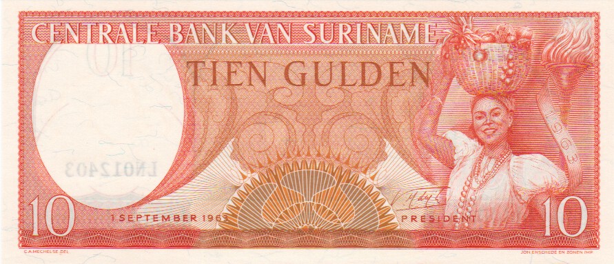 Suriname 10 Gulden,  1. 9.196312110 Gulden 1. 9.1963UNC£1.50