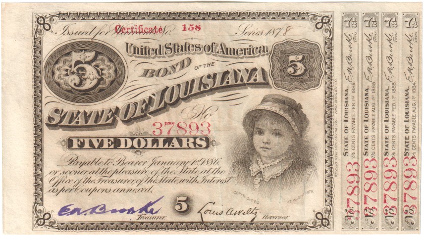United States Of America State of Louisiana Bond, 5 Dollars, 1878 - - -State of Louisiana Bond, 5 Dollars1878UNC£18.00