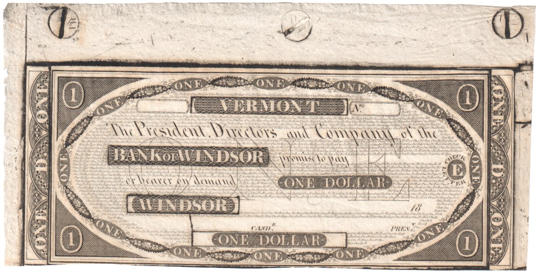 United States Of America The Bank of Windsor, Vermont, 1 Dollar, 18 - - - - -The Bank of Windsor, Vermont, 1 Dollar18 - -VF£35.00Signed but undated