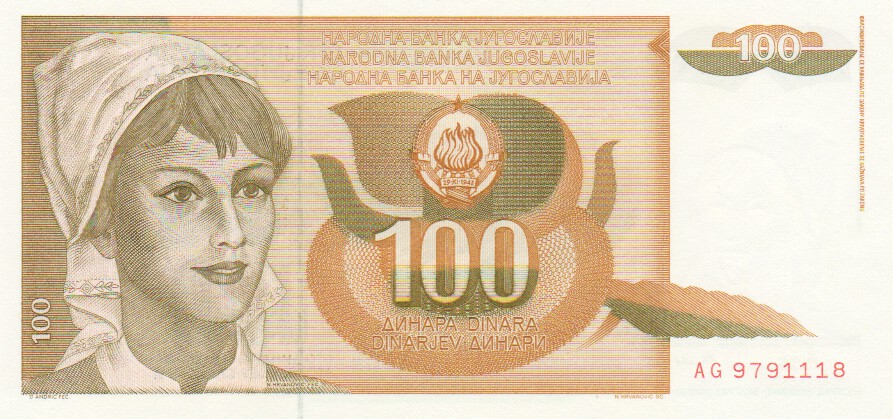Yugoslavia 100 Dinara, 1992112100 Dinara1992UNC£0.80