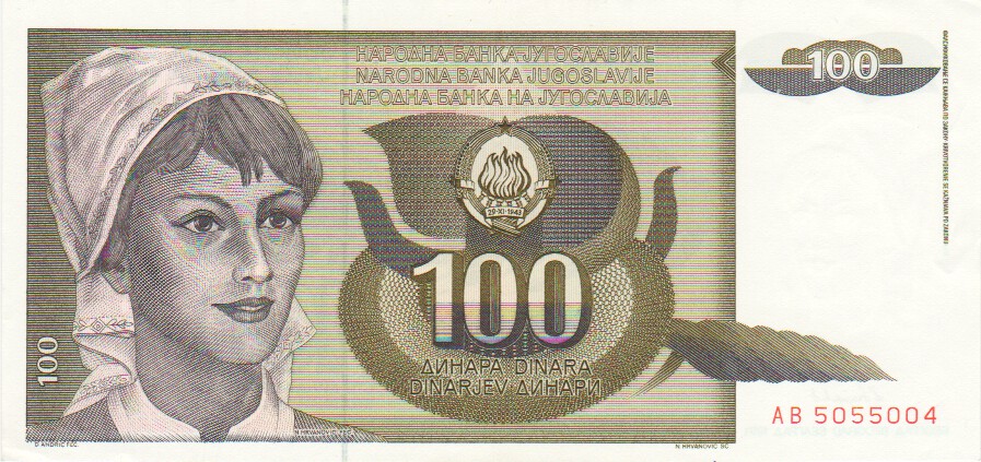 Yugoslavia 100 Dinara,  1. 3.1990105100 Dinara 1. 3.1990UNC£5.00