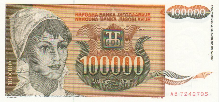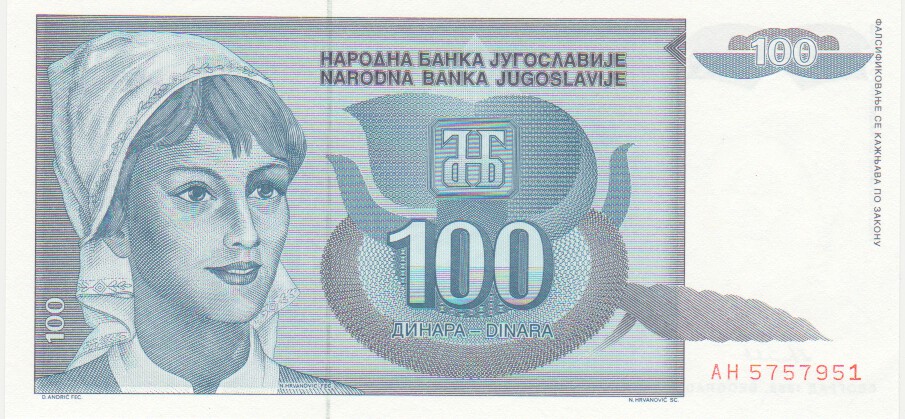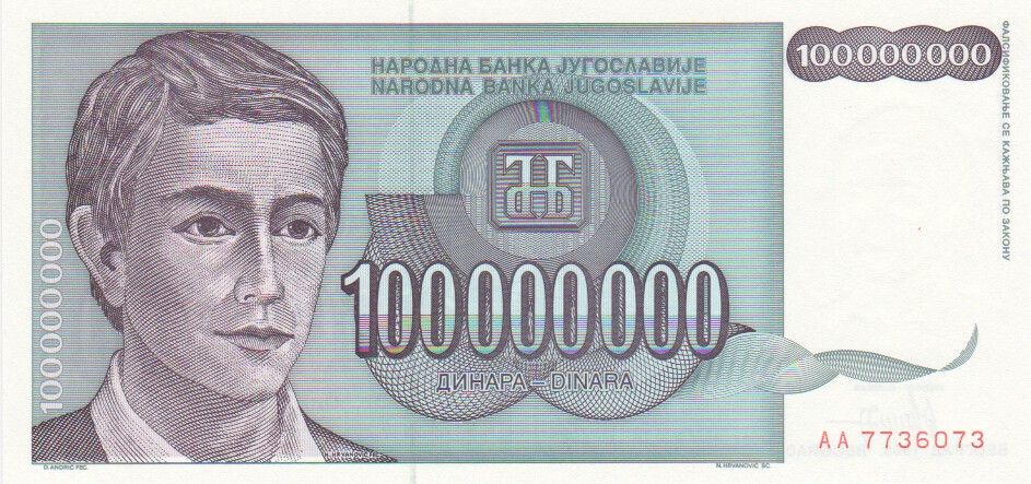 Yugoslavia 100,000,000 Dinara, 1993124100,000,000 Dinara1993UNC£2.50