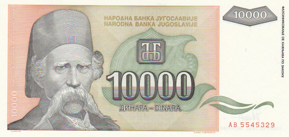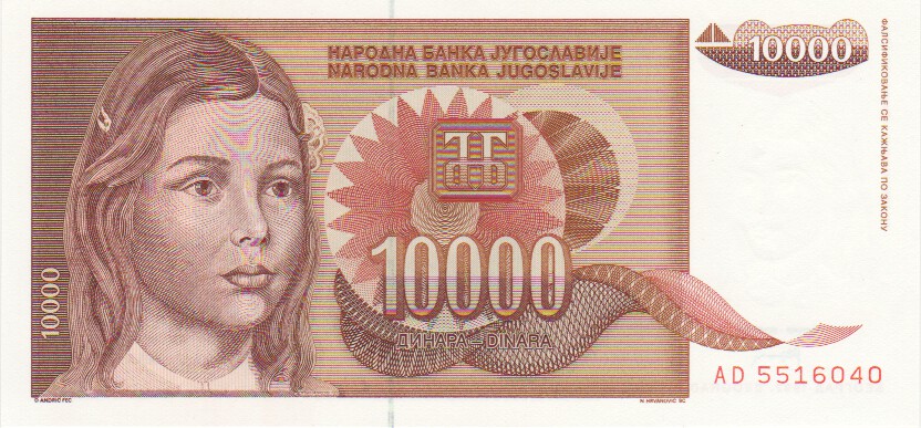 Yugoslavia 10,000 Dinara, 199312910,000 Dinara1993UNC£3.50