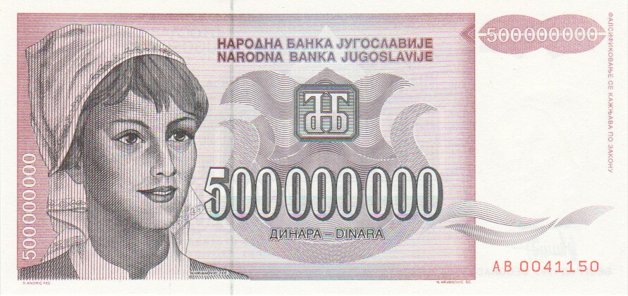 Yugoslavia 500,000,000 Dinara, 1993125500,000,000 Dinara1993UNC£4.50