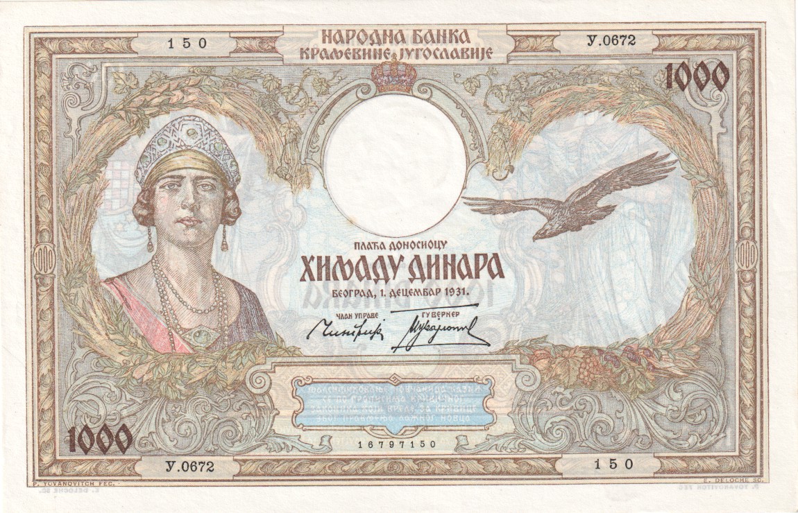 Yugoslavia 1000 Dinara,  1.12.1931291000 Dinara 1.12.1931VF+£12.00