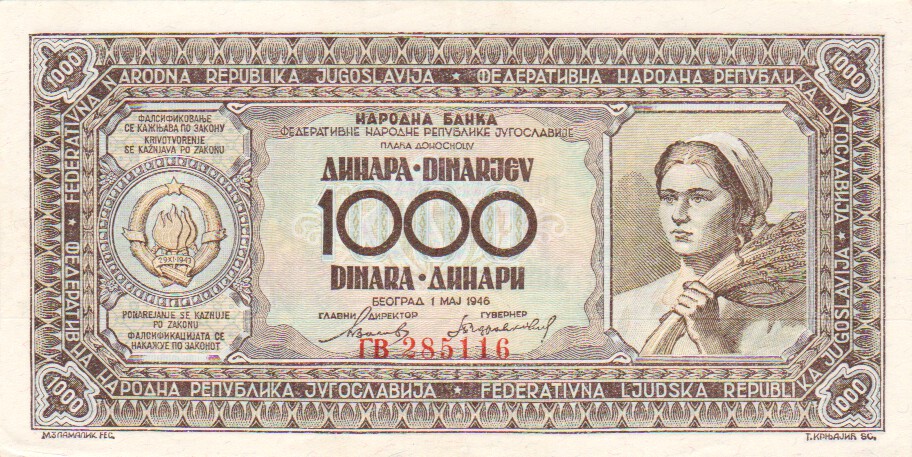 Yugoslavia 1000 Dinara,  1. 5.1946671000 Dinara 1. 5.1946F£9.00