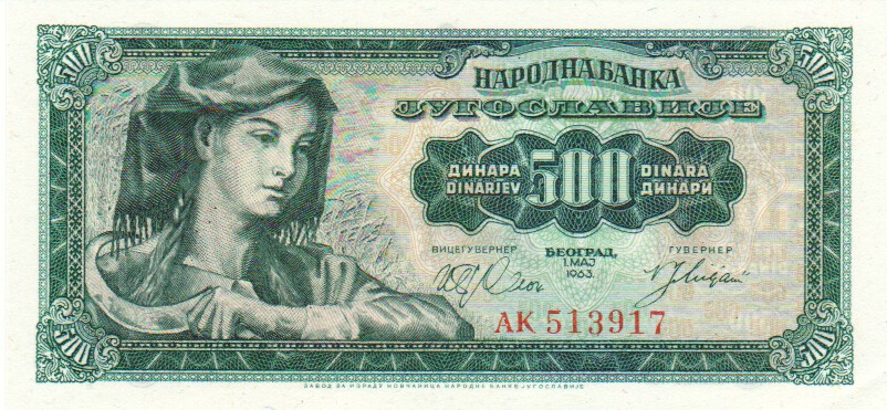 Yugoslavia 500 Dinara,  1. 5.196374a500 Dinara 1. 5.1963UNC£3.50
