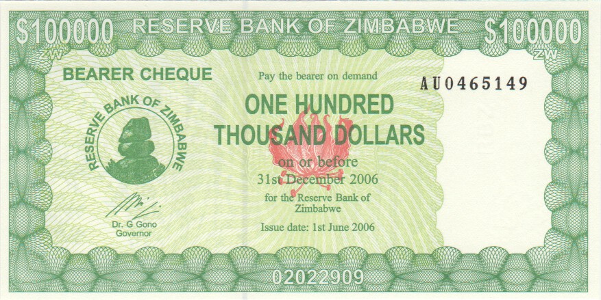 Zimbabwe 100,000 Dollars,  1. 6.200632100,000 Dollars 1. 6.2006UNC£6.50
