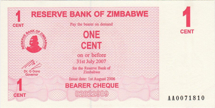 Zimbabwe 1 Cent,  1. 8.2006331 Cent 1. 8.2006UNC£2.00Currency revaluation 2006; 1 new Dollar = 1000 old Dollars