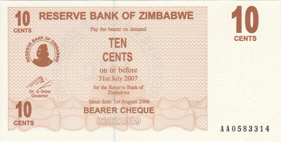 Zimbabwe 10 Cents,  1. 8.20063510 Cents 1. 8.2006UNC£1.20