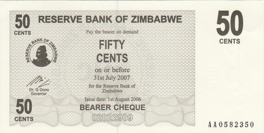 Zimbabwe 50 Cents,  1. 8.20063650 Cents 1. 8.2006UNC£2.00
