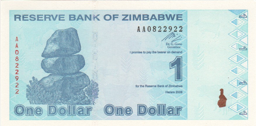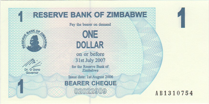 Zimbabwe 1 Dollar, 2007 (2008)651 Dollar2007 (2008)UNC£0.80Currency revaluation August 2008; 1 new Dollar = 10,000,000,000 old Dollars