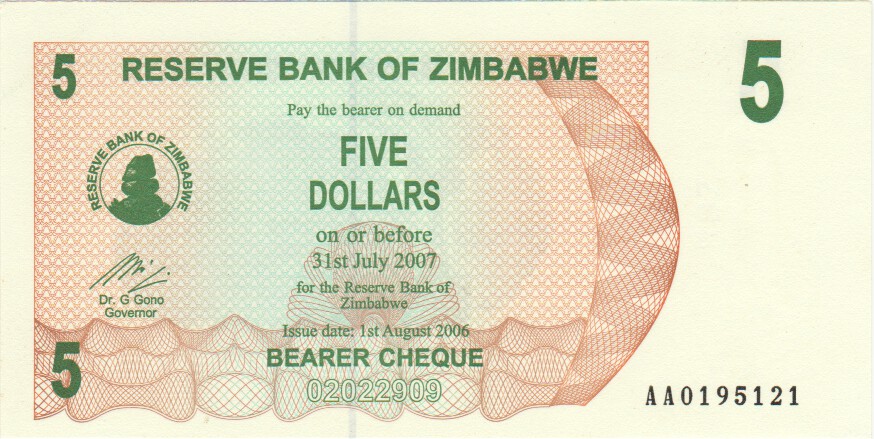 Zimbabwe 5 Dollars,  1. 8.2006385 Dollars 1. 8.2006UNC£0.80