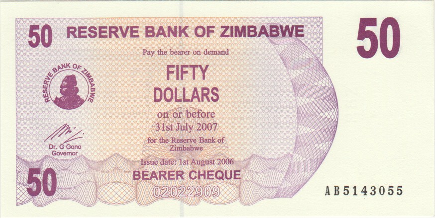 Zimbabwe 50 Dollars,  1. 8.20064150 Dollars 1. 8.2006UNC£1.00