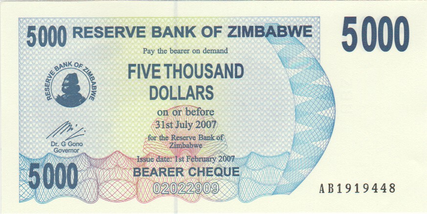 Zimbabwe 5000 Dollars,  1. 2.2007455000 Dollars 1. 2.2007UNC£3.50