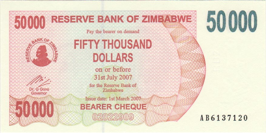 Zimbabwe 50,000 Dollars,  1. 3.20074750,000 Dollars 1. 3.2007UNC£4.00