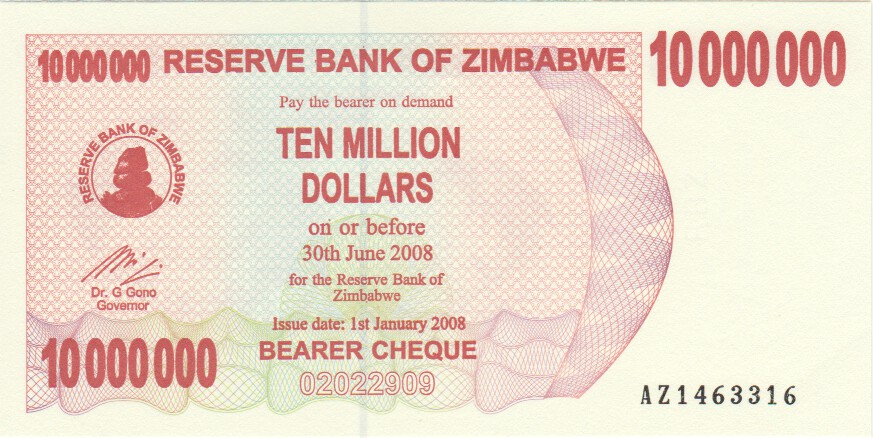 Zimbabwe 10 Million Dollars,  1. 1.20085510 Million Dollars 1. 1.2008UNC£4.00