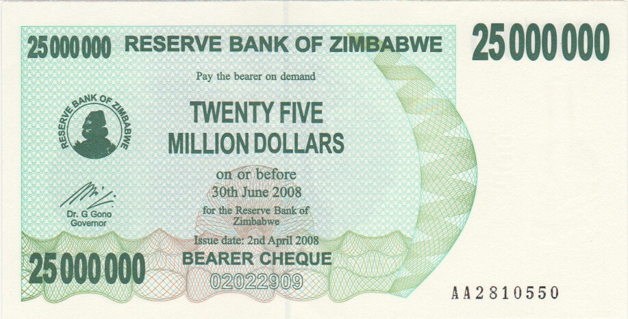 Zimbabwe 25 Million Dollars,  2. 4.20085625 Million Dollars 2. 4.2008UNC£2.50