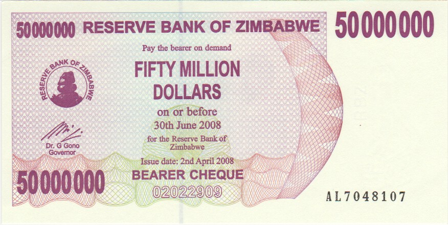 Zimbabwe 50 Million Dollars,  2. 4.20085750 Million Dollars 2. 4.2008UNC£2.00