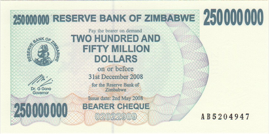 Zimbabwe 250 Million Dollars,  2. 5.200859250 Million Dollars 2. 5.2008UNC£3.00