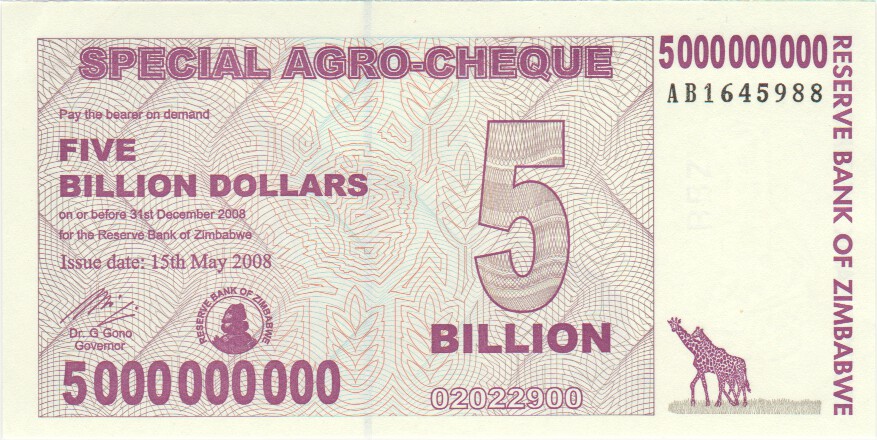 Zimbabwe 5 Billion Dollars, 15. 5.2008615 Billion Dollars15. 5.2008UNC£4.00